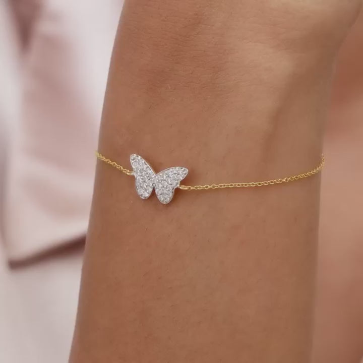 This bracelet features a butterfly motif in the centre studded with diamonds.