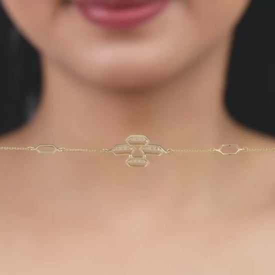 This pure gold bracelet features four hexagon motifs attached to each other at the centre, each set with lab-grown diamonds, with one hexagon each on the chain.
